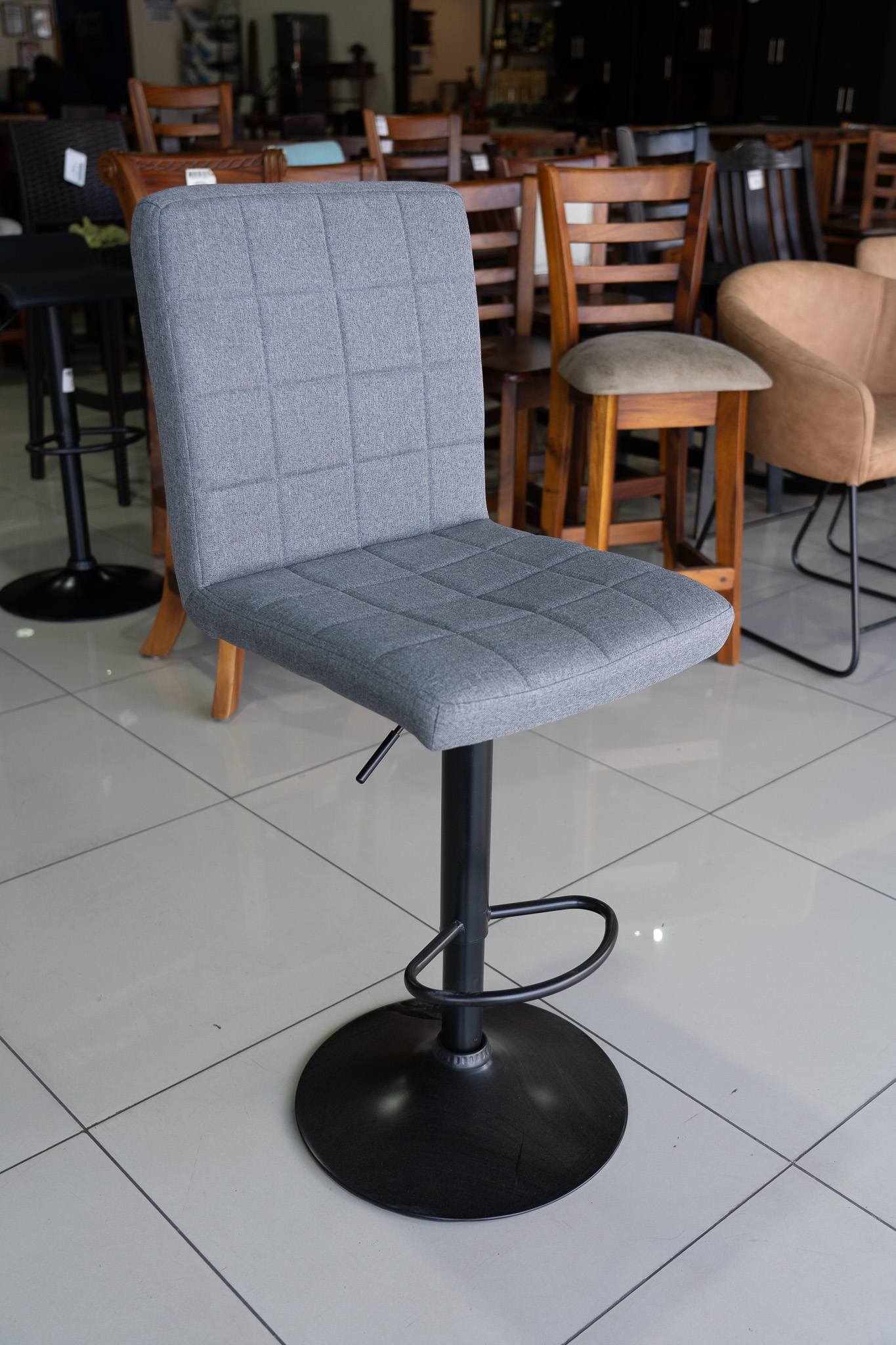 Banco Elevable con Tapizado en Tela – Confort Ajustable y Estilo Moderno Este banco con altura regulable cuenta con un asiento tapizado en tela, brindando suavidad y comodidad. Ideal para barras, islas de cocina o espacios multifuncionales que buscan practicidad con un toque elegante y contemporáneo.