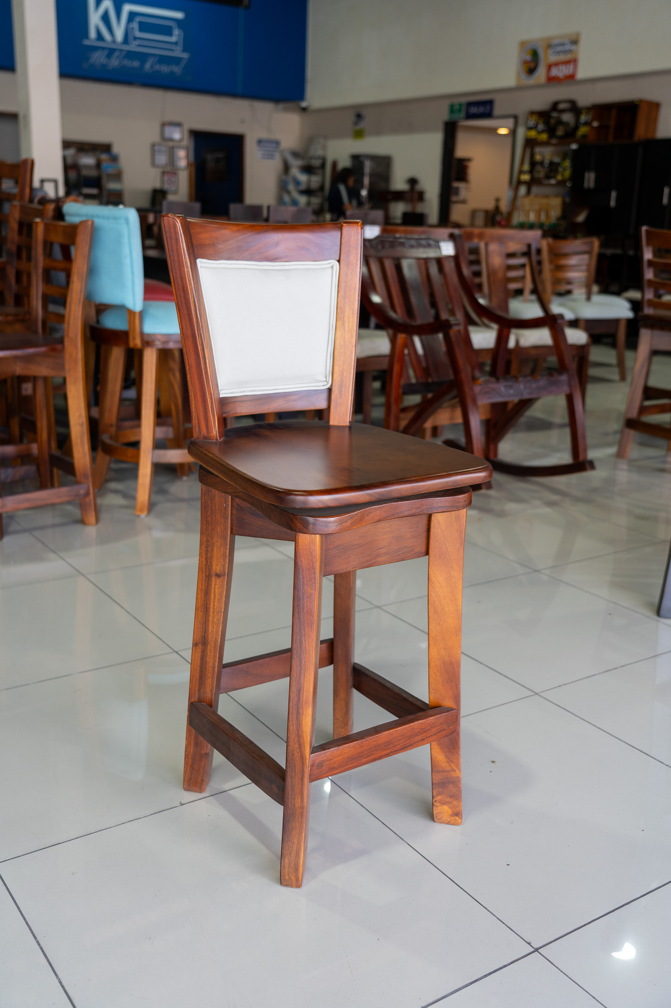 Este elegante banco giratorio está fabricado en madera sólida de cenízaro y cuenta con respaldo tapizado, brindando mayor confort y un acabado refinado. Ideal para barras, islas de cocina o espacios modernos que buscan funcionalidad sin perder calidez y diseño.